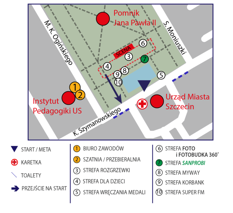 Kolejny raz trasa przebiegnie głównie alejkami parku Kasprowicza. Do pokonania będą dwie pętle, po 2,5 km każda. Start i meta, jak zawsze na pięknych szczecińskich Jasnych Błoniach. W tej przestrzeni będą również koncentrowały się główne aktywności organizatora wydarzenia oraz sponsorów.